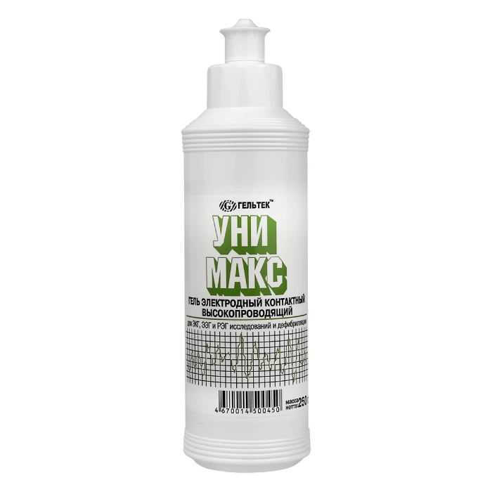 Гель электродный контактный с высокой электропроводностью используется для ЭКГ, дефибрилляции, ЭЭГ, РЭГ, ЭМГ, регистрации вызванных потенциалов (ВП).